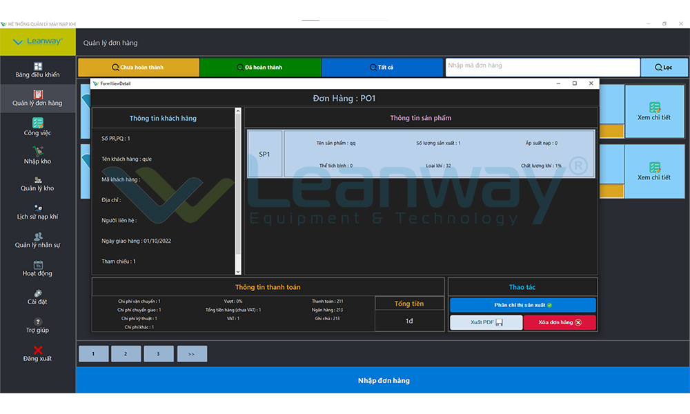 • Nhập đơn hàng: Đơn hàng được nhập vào dễ dàng qua giao diện đặt hàng, thông tin PO đơn hàng, thông tin đơn hàng, thông tin sản phẩm như mã bình, loại bình, loại khí, độ tinh khiết, số lượng bình, đơn giá, thành tiền….